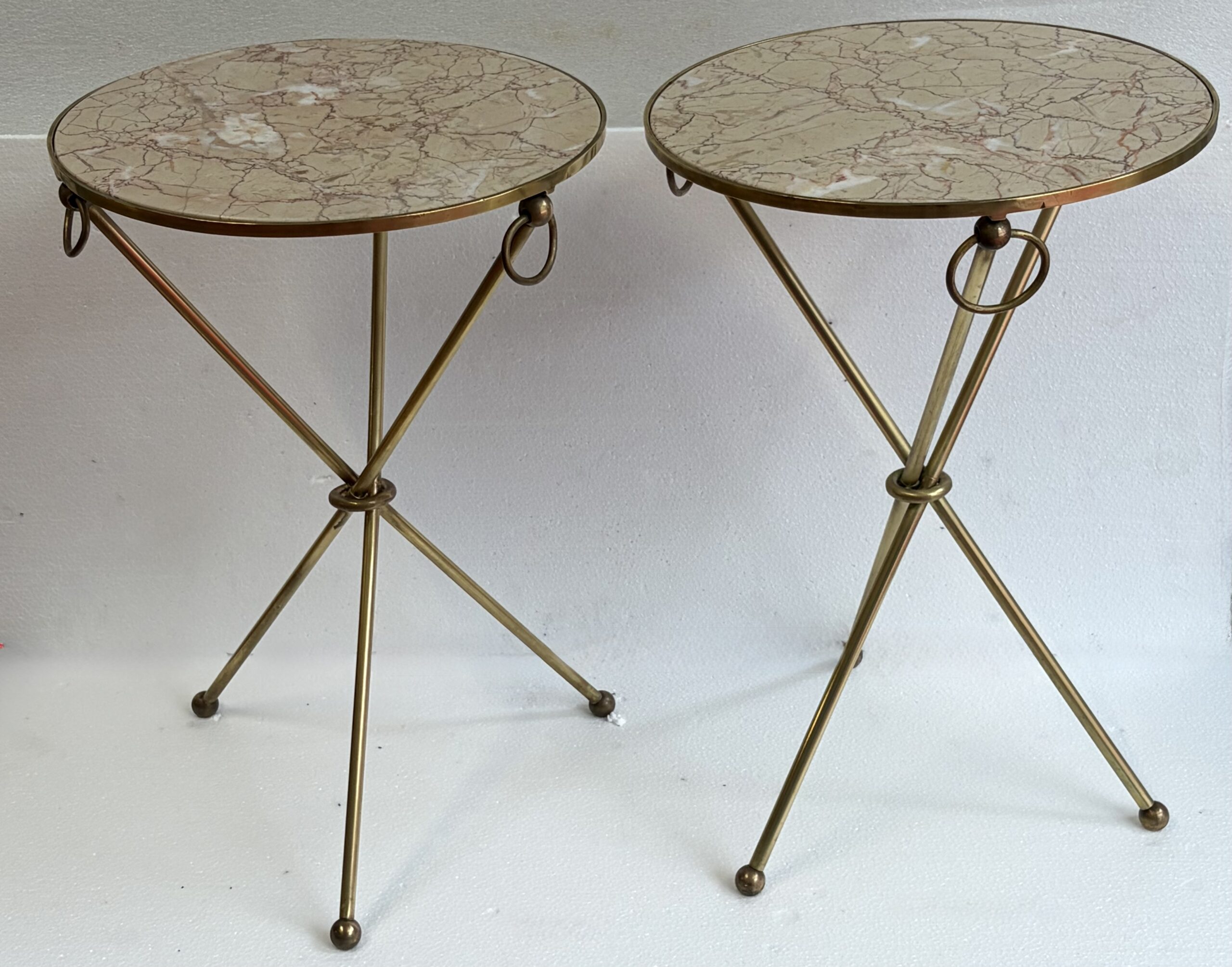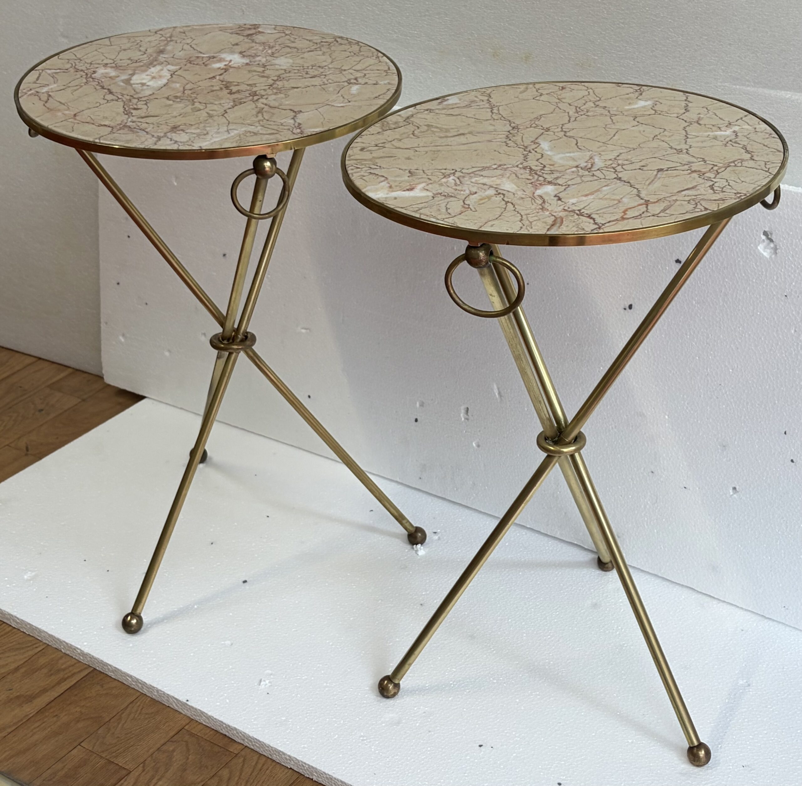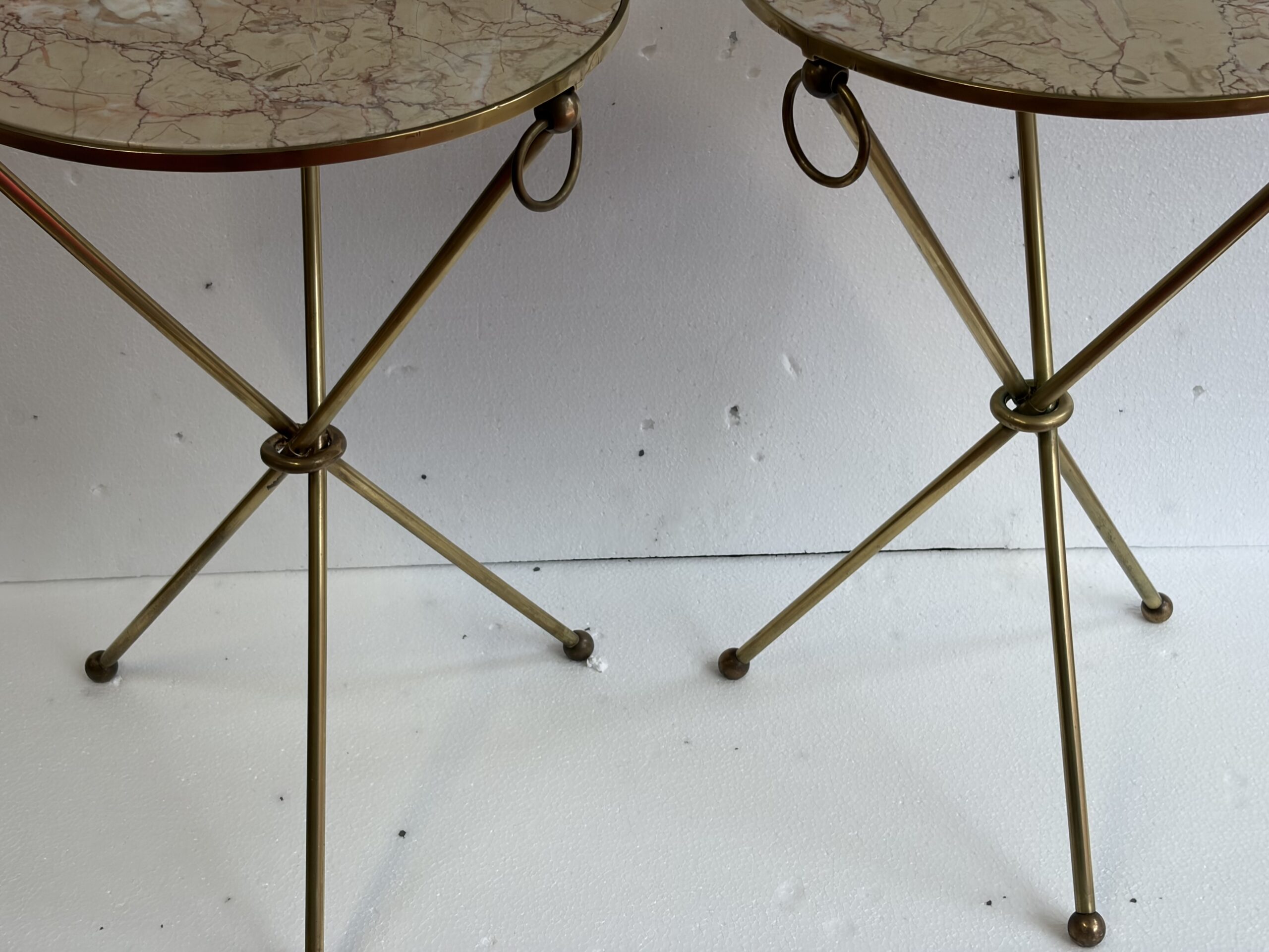 Pair of unsigned tripod side tables in patinated brass with buckles at the top of the legs, feet ending in balls, Calacatta pink marble tops; all parts are screwed together.