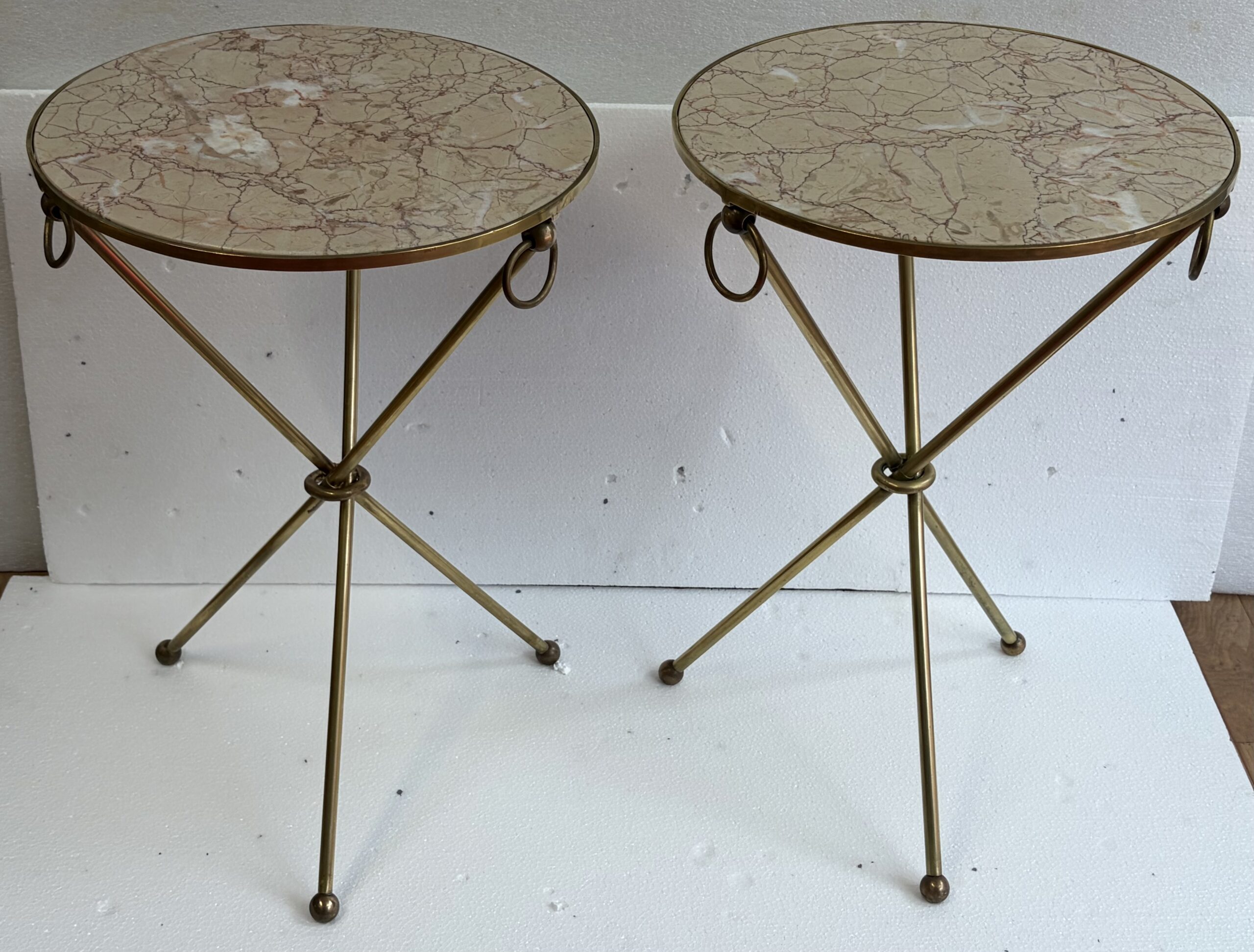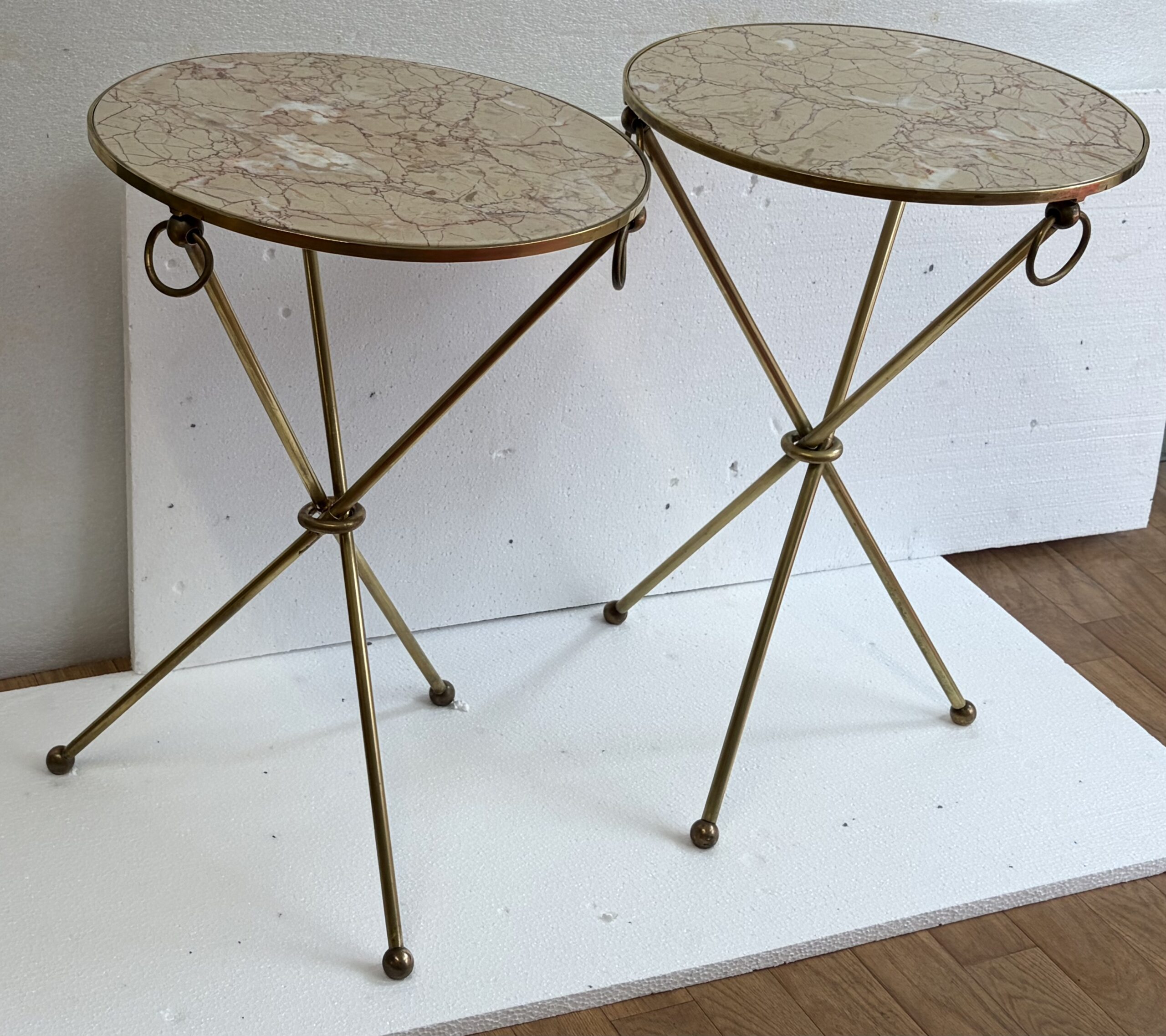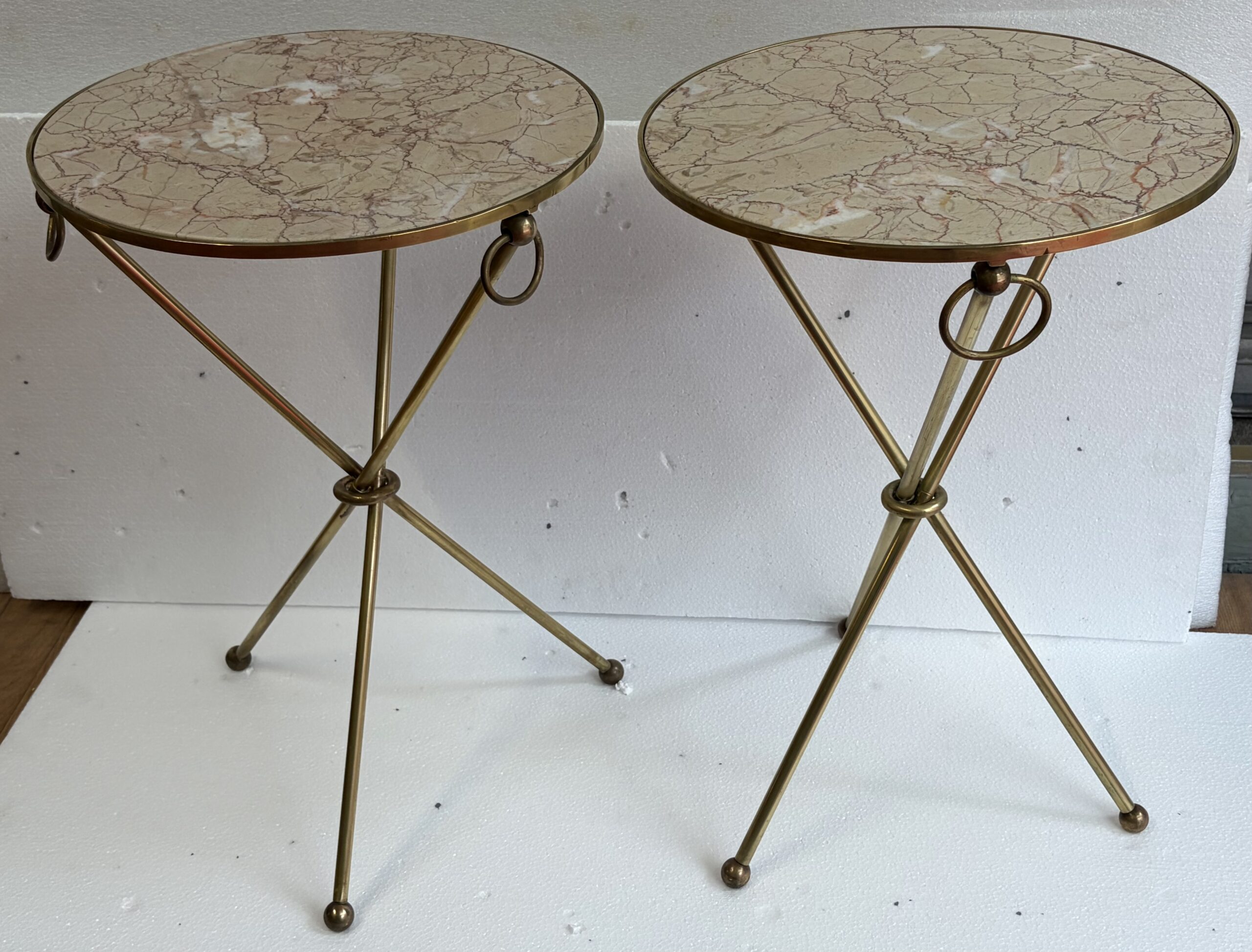 Pair of unsigned tripod side tables in patinated brass with buckles at the top of the legs, feet ending in balls, Calacatta pink marble tops; all parts are screwed together.