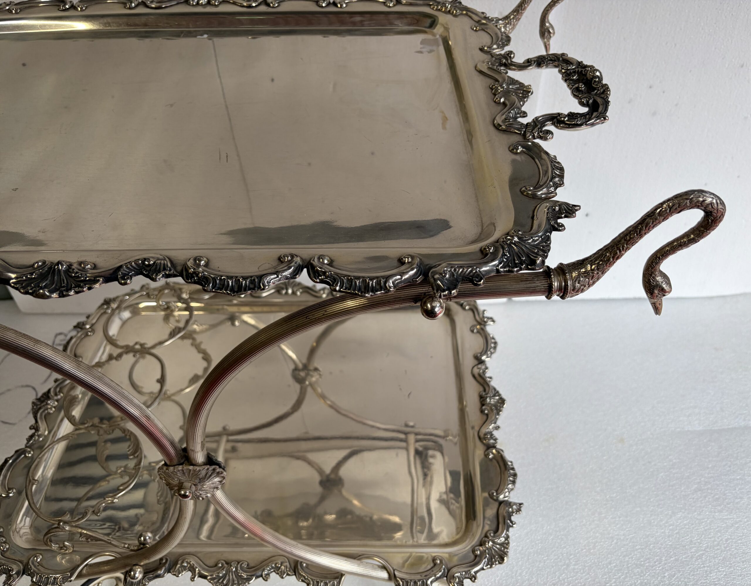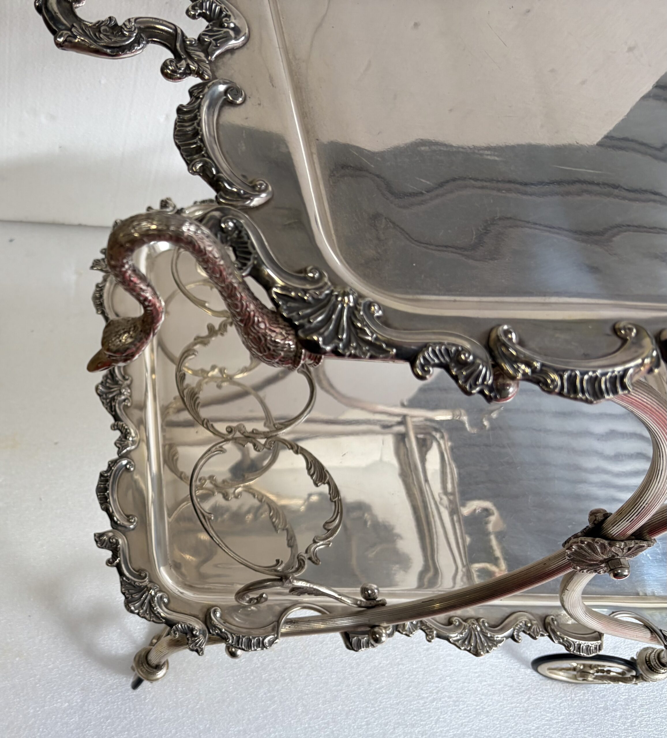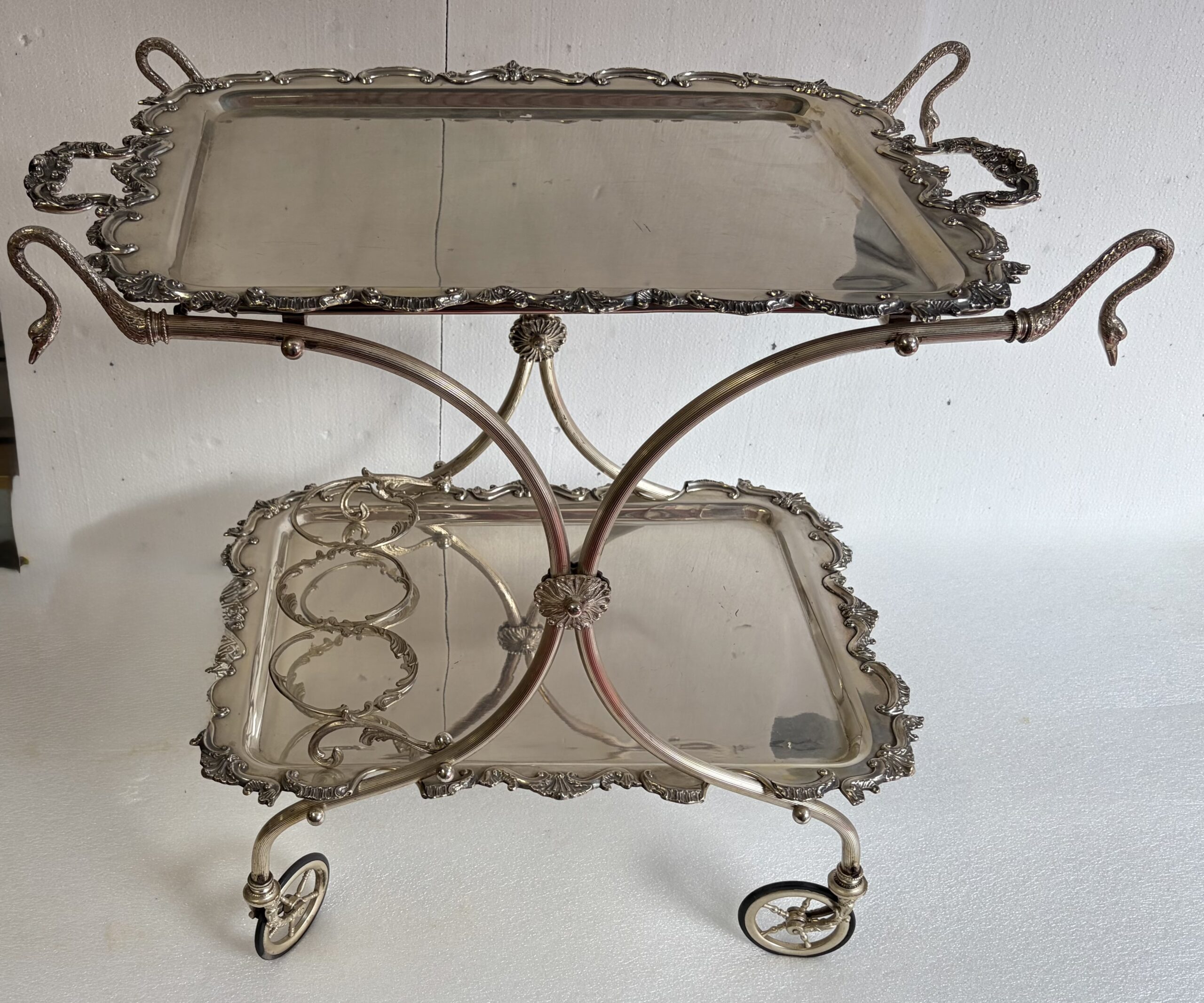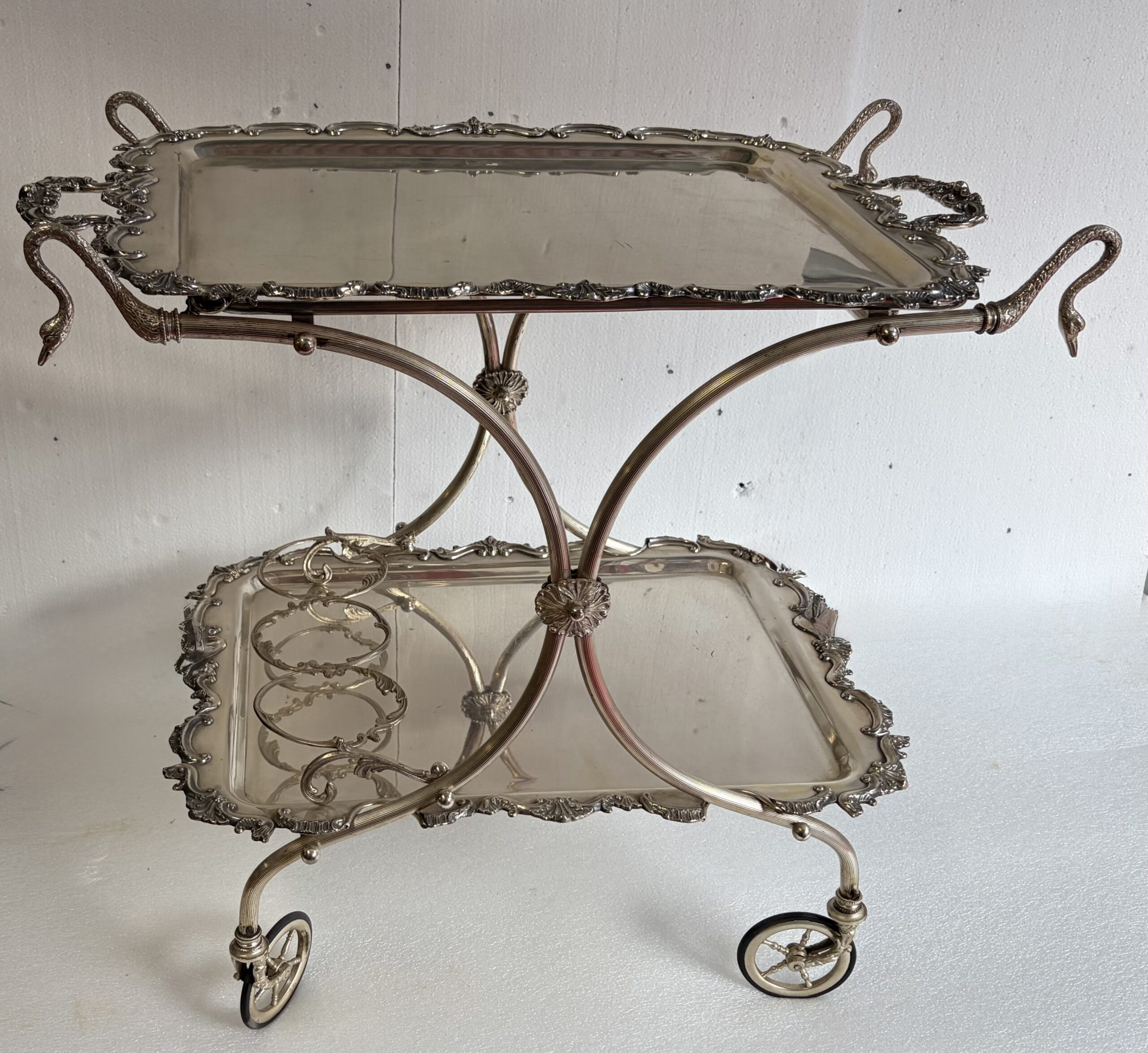 Silver-plated metal trolley with removable tray, With Swan Neck decor, everything can be taken apart.