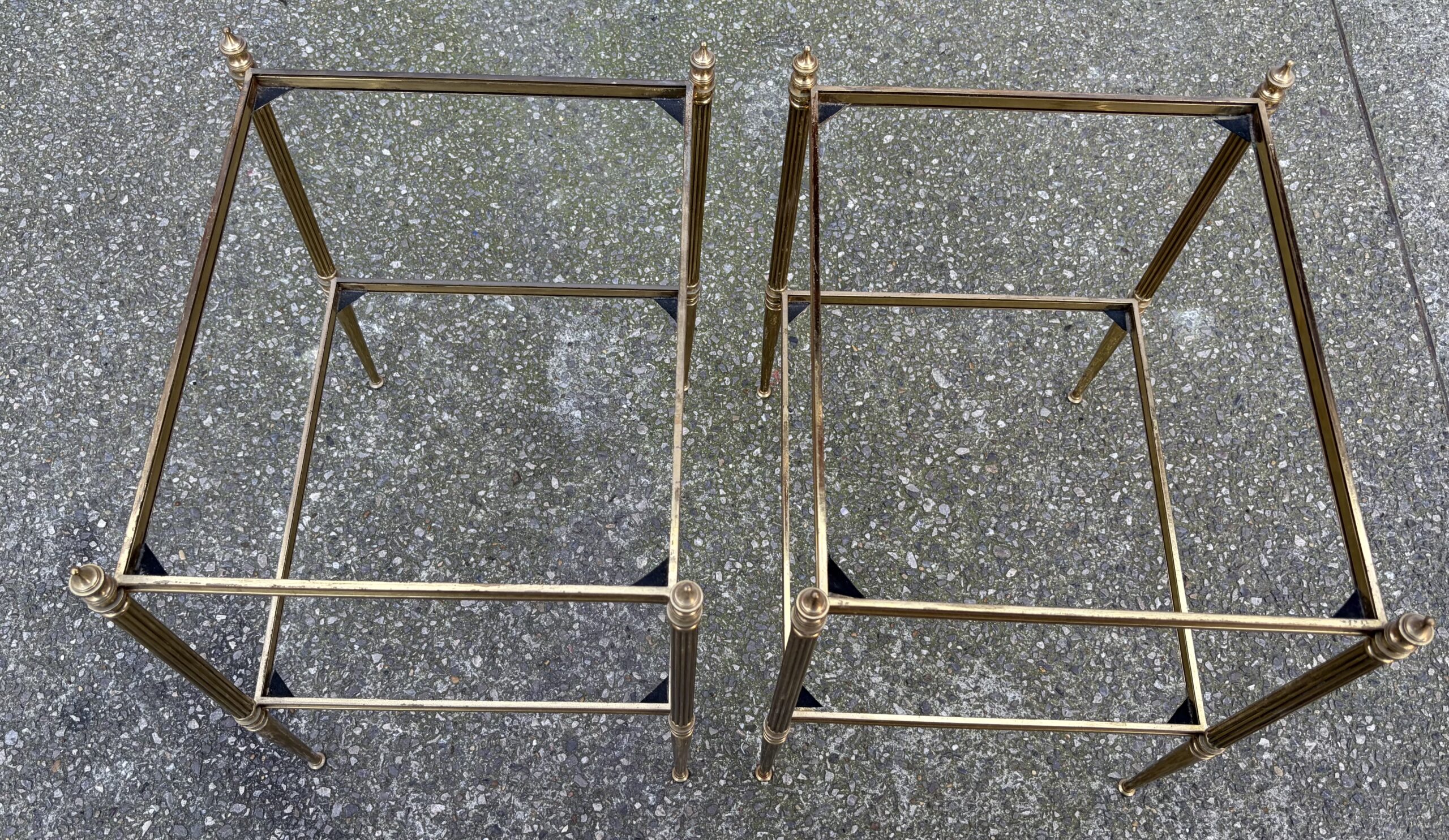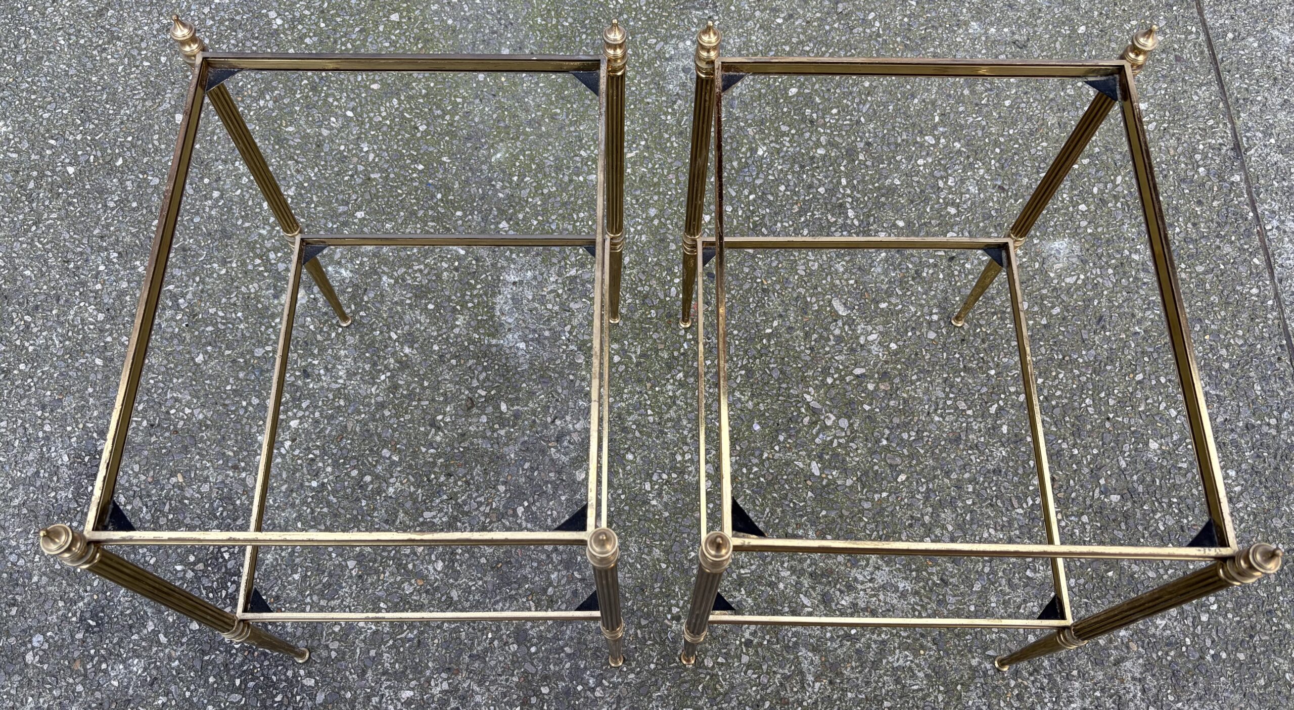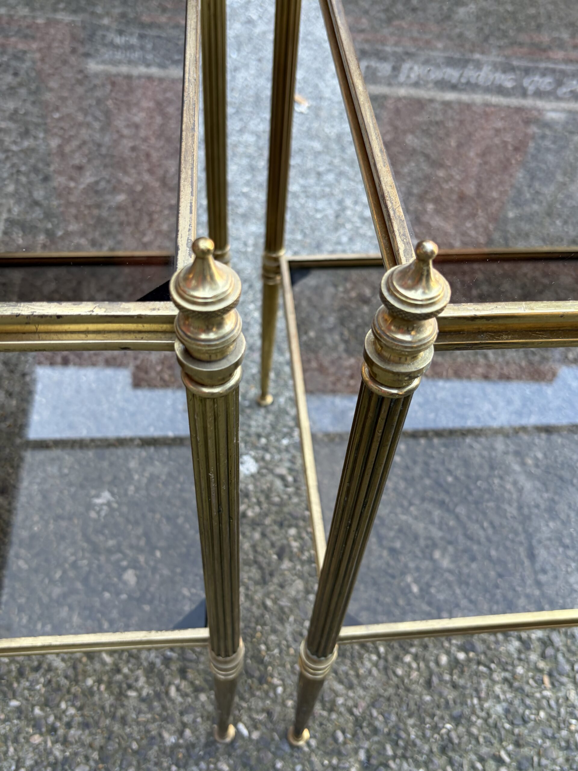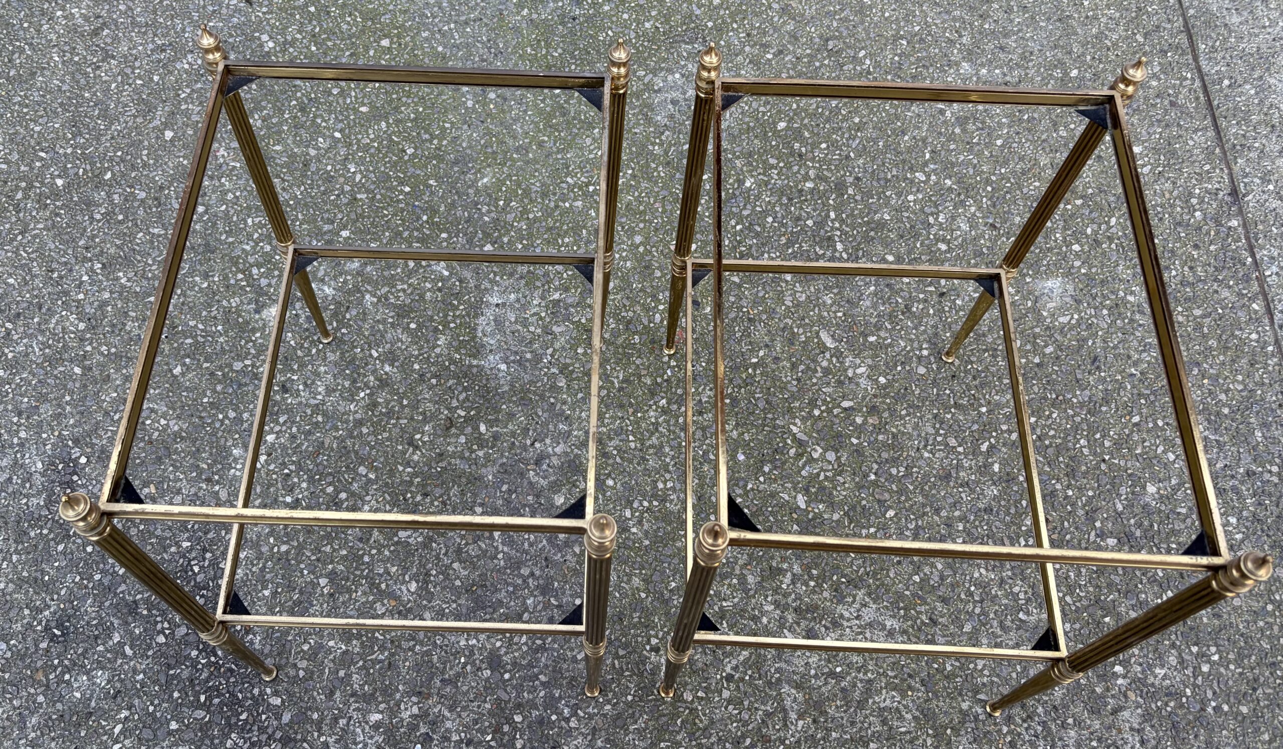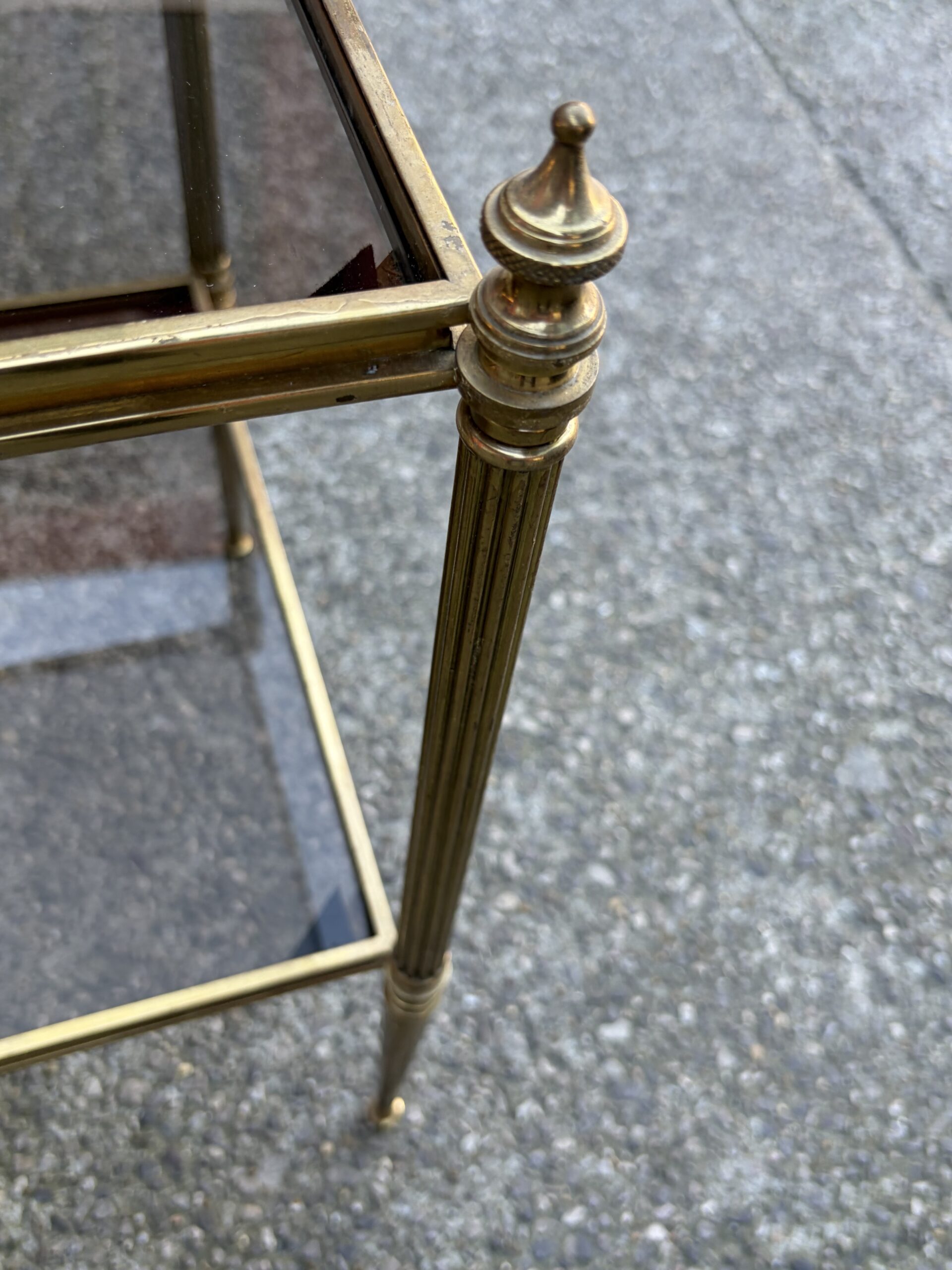 Pair of brass and bronze end tables with two levels of smoked glass, spinning tops at the top of the legs.