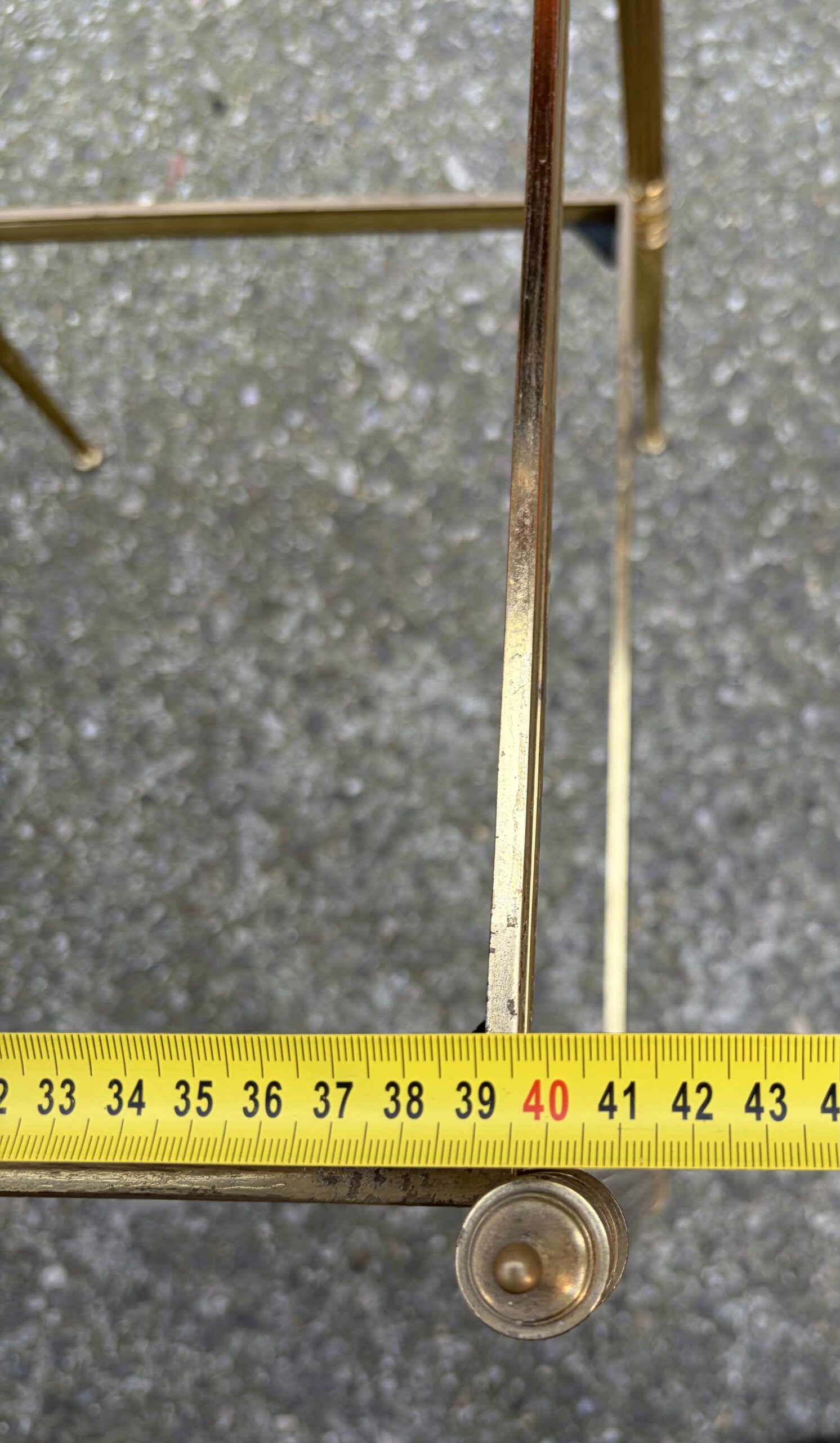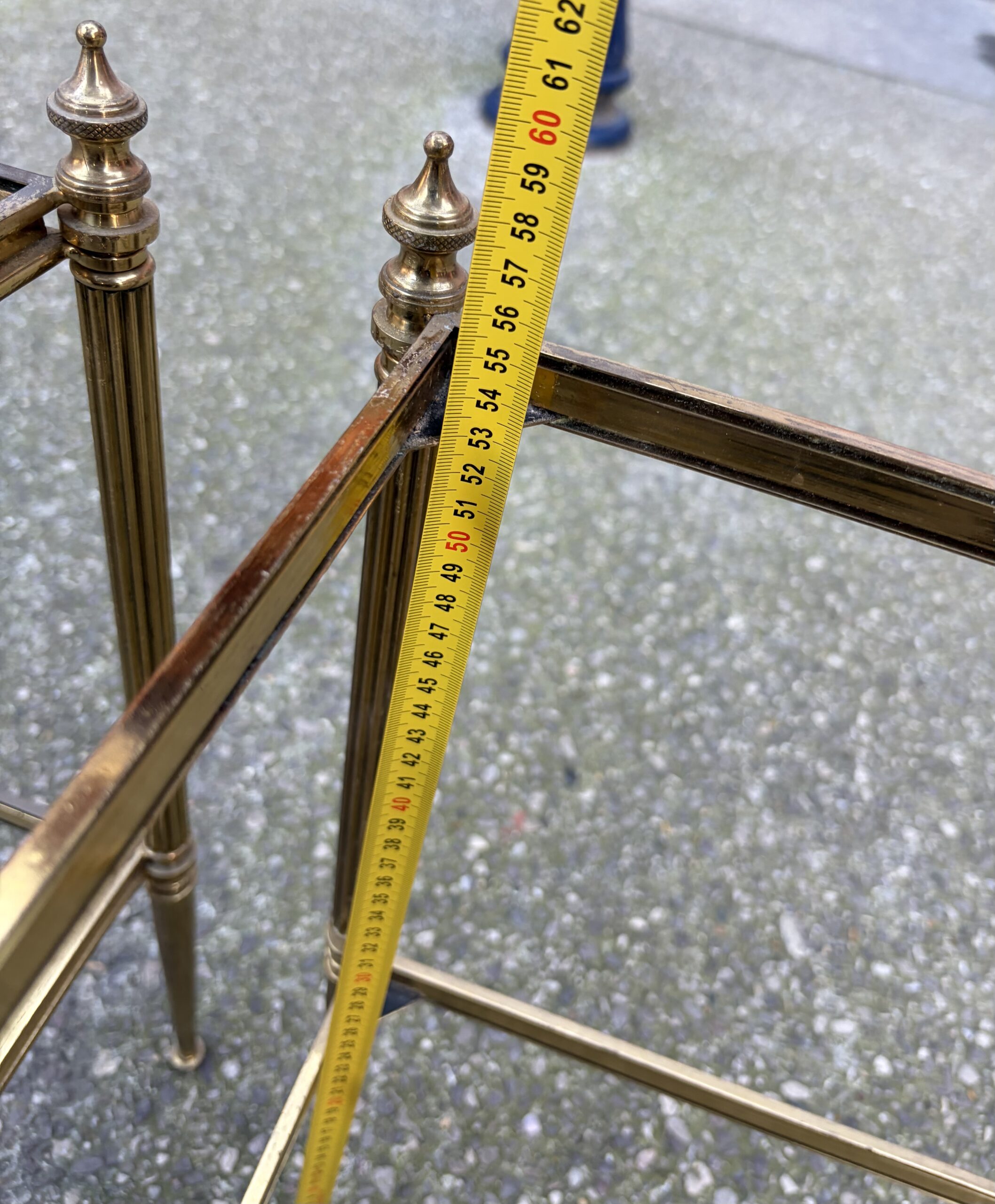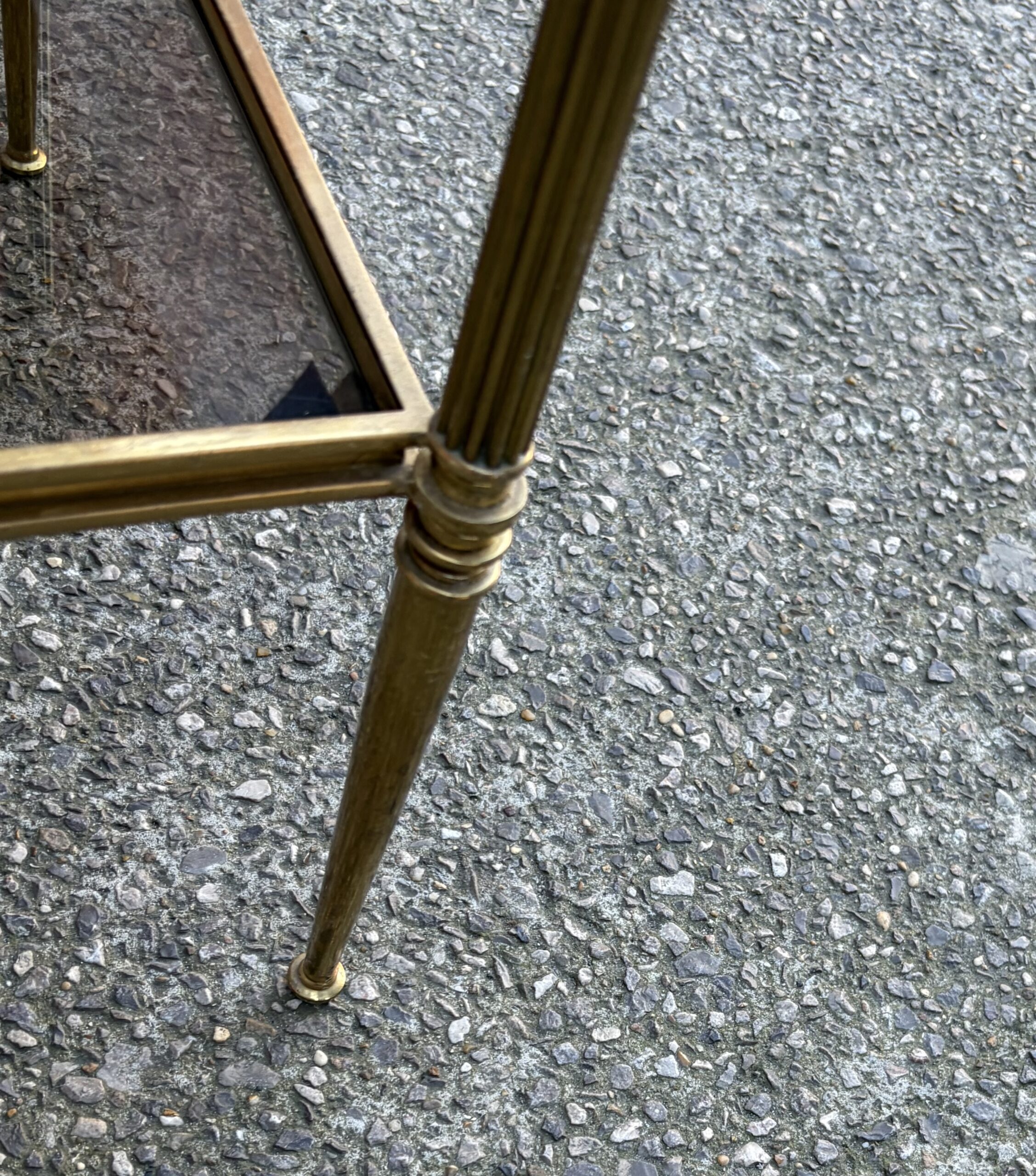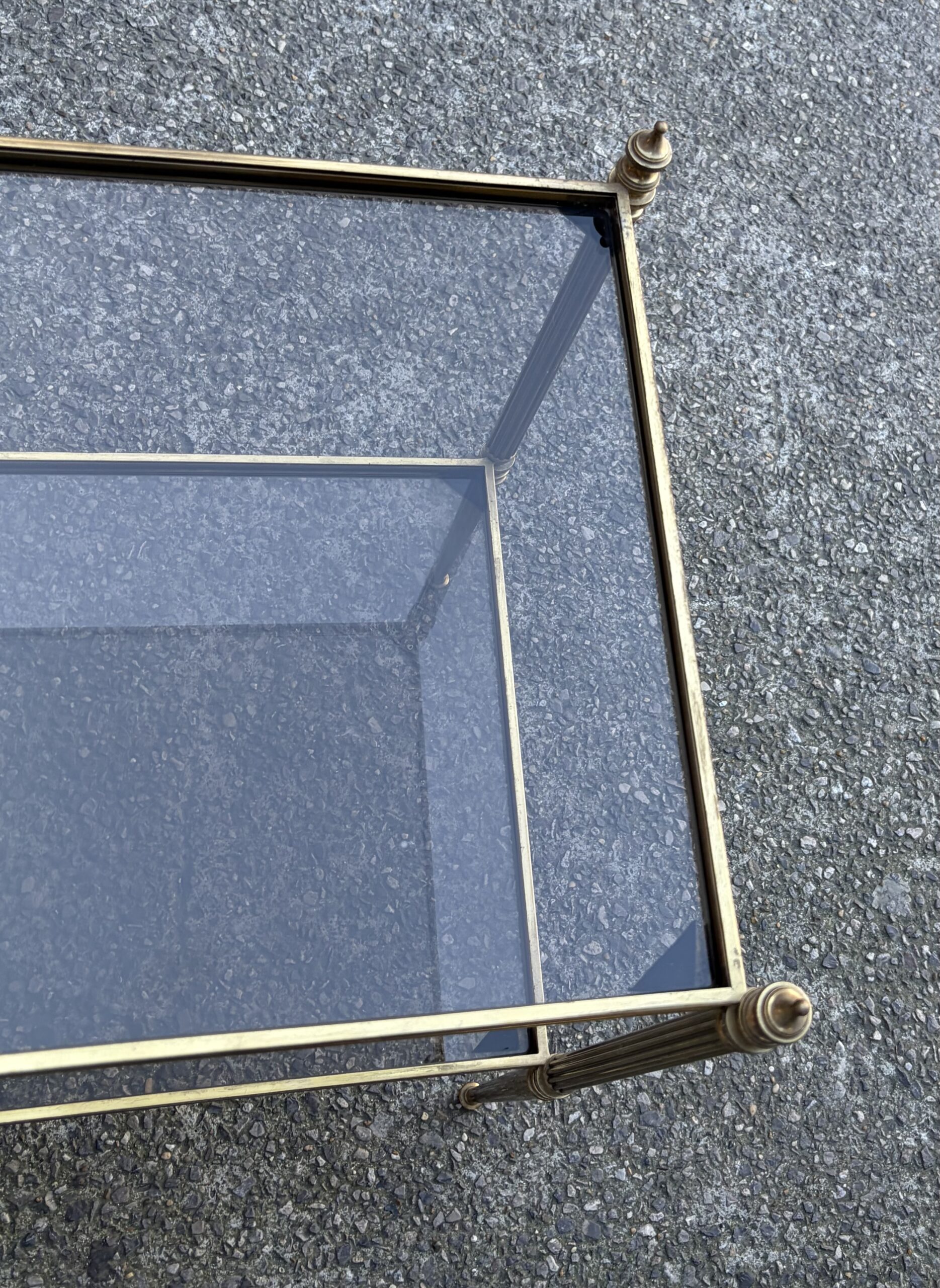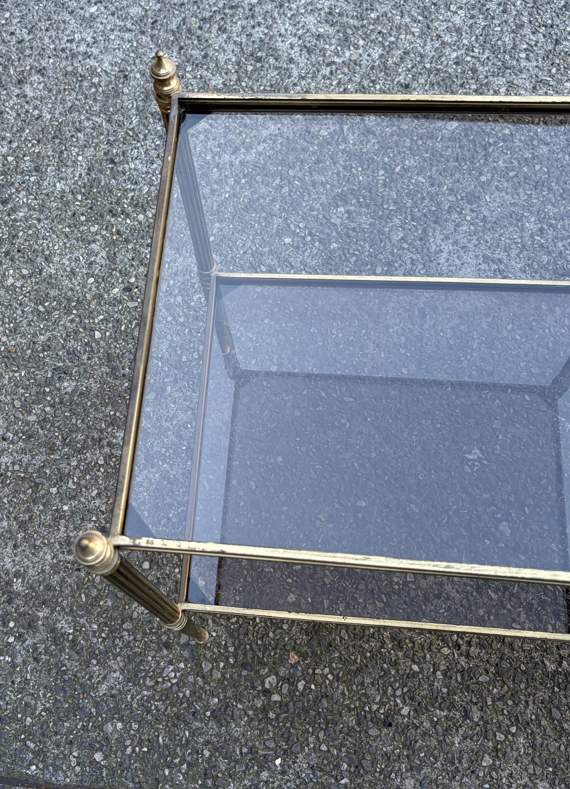 Pair of brass and bronze end tables with two levels of smoked glass, spinning tops at the top of the legs.