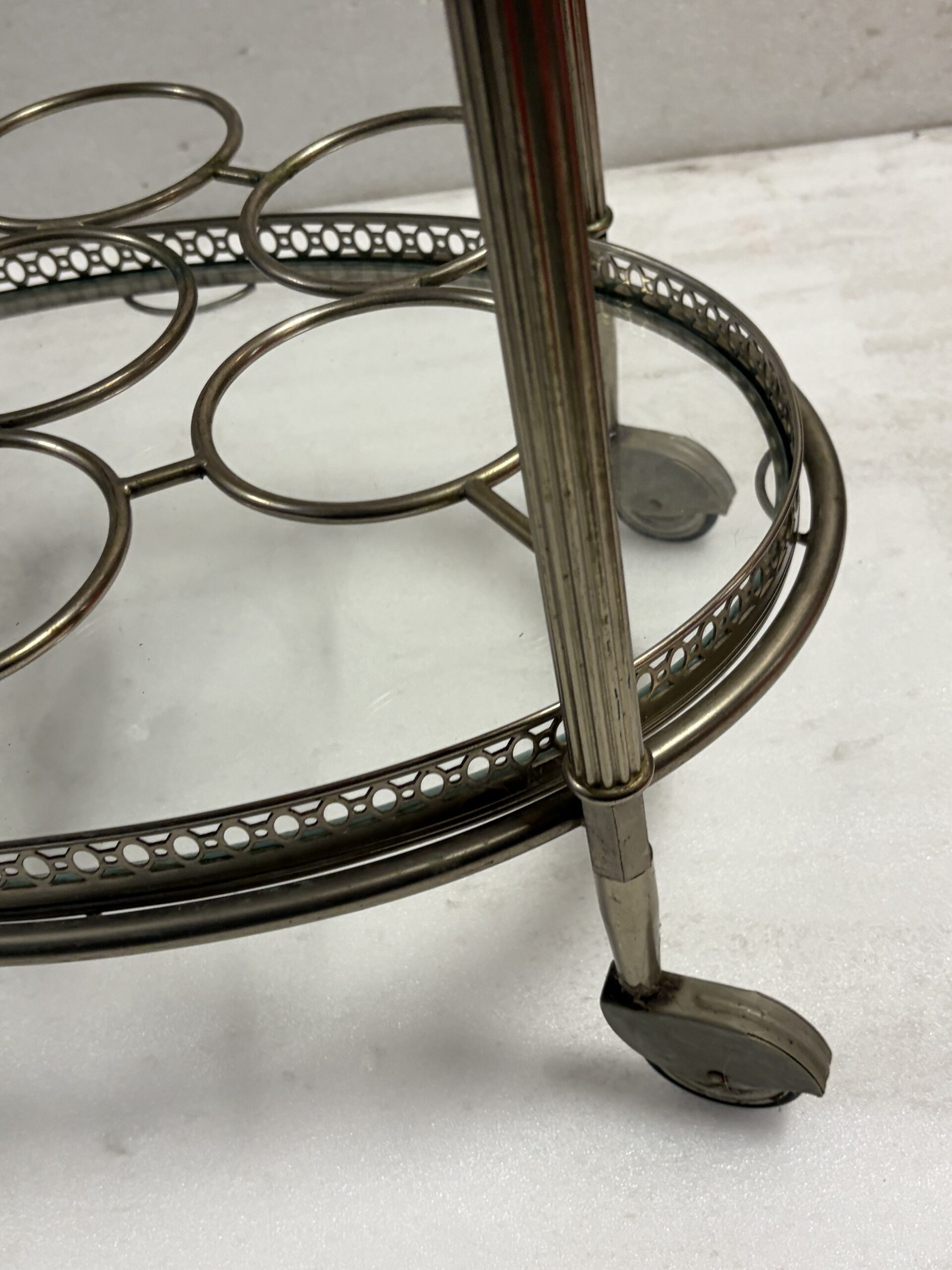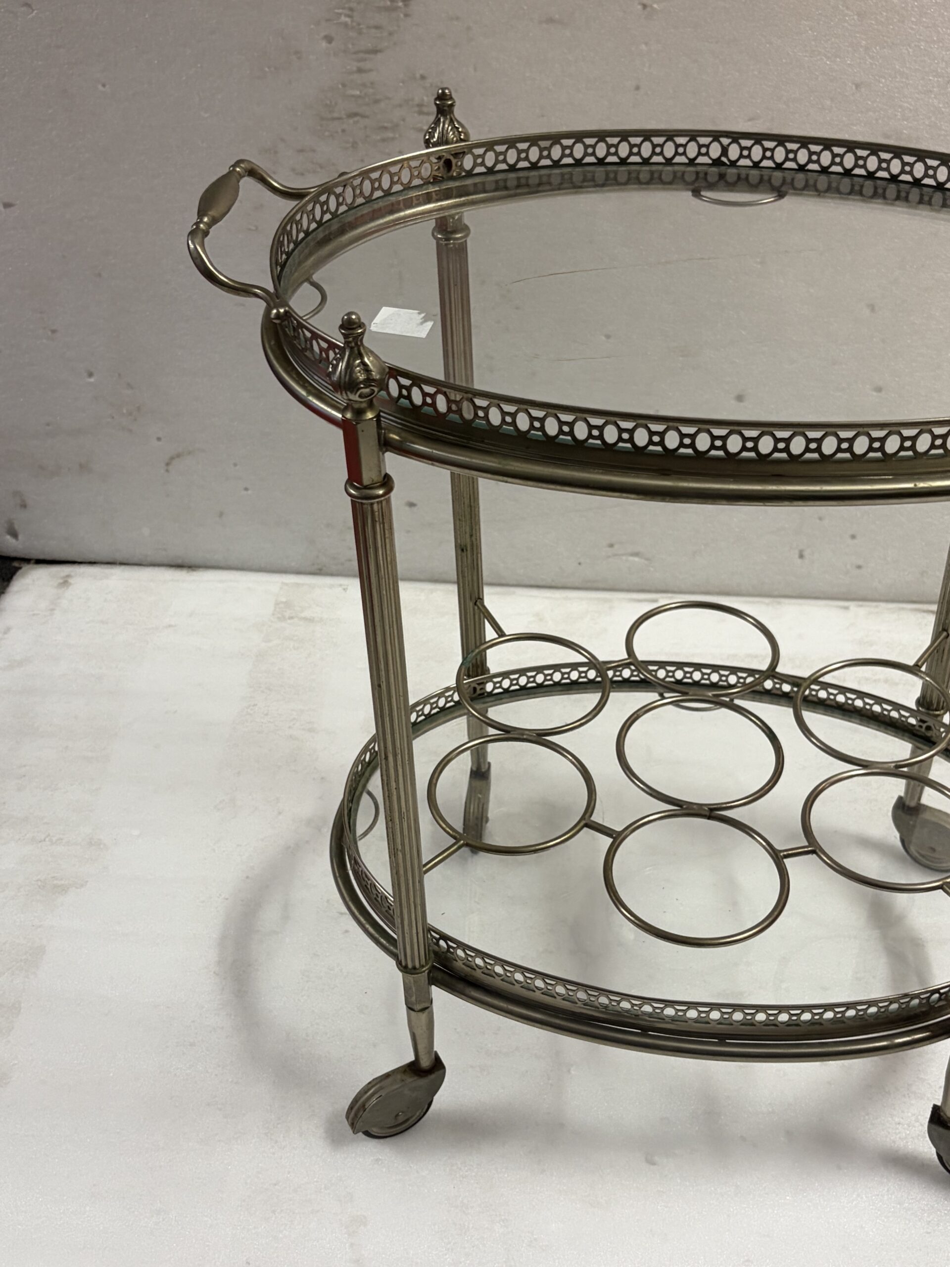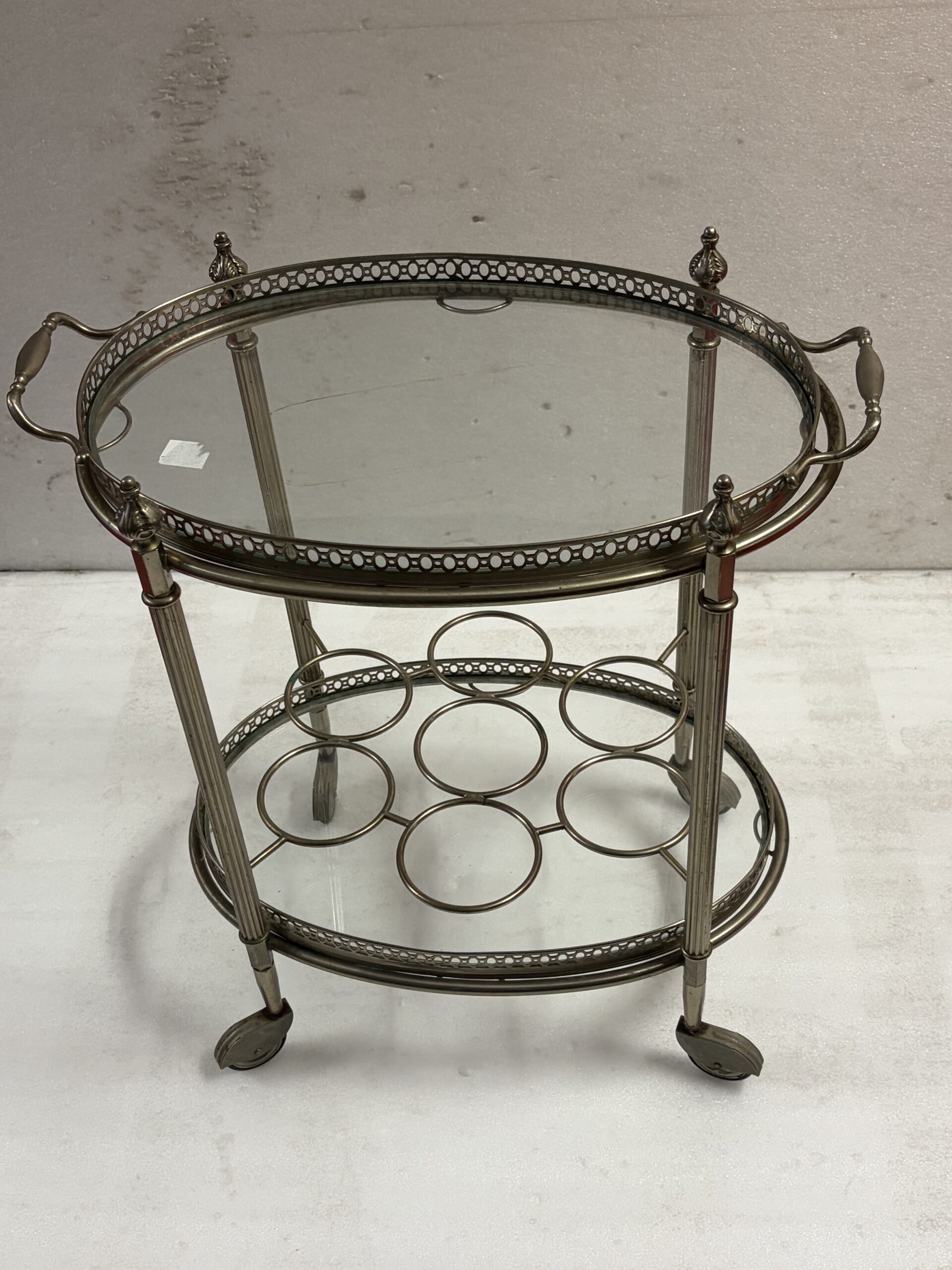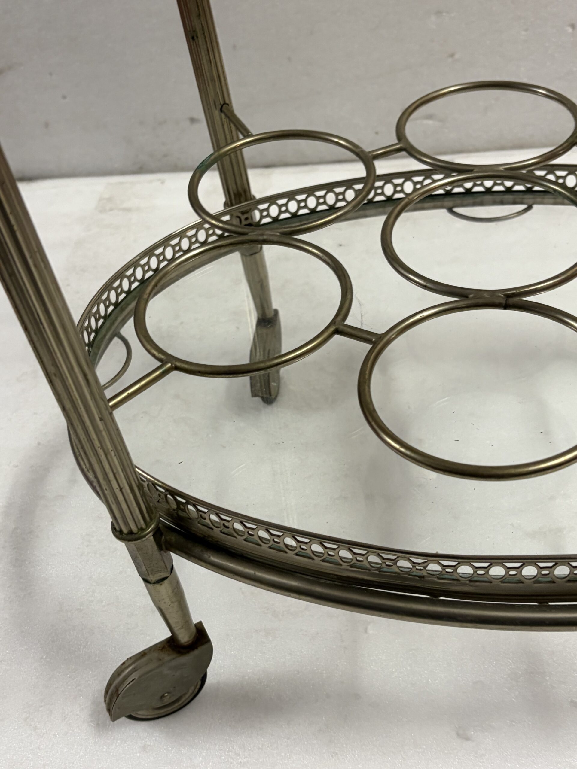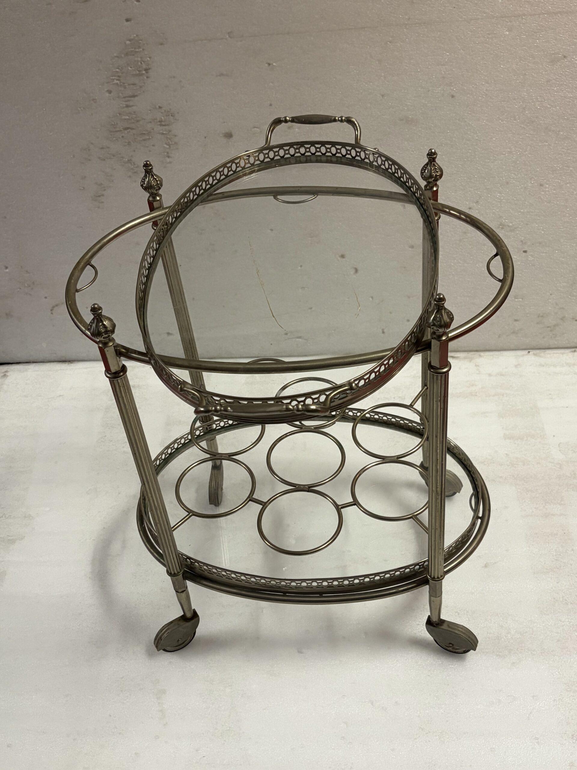 Rolling bar with 2 glass shelves, Bottle rack Circa 1970, used condition Length: 55 cm to the handles Width: 36 cm Height: 62 cm to the top of the uprights