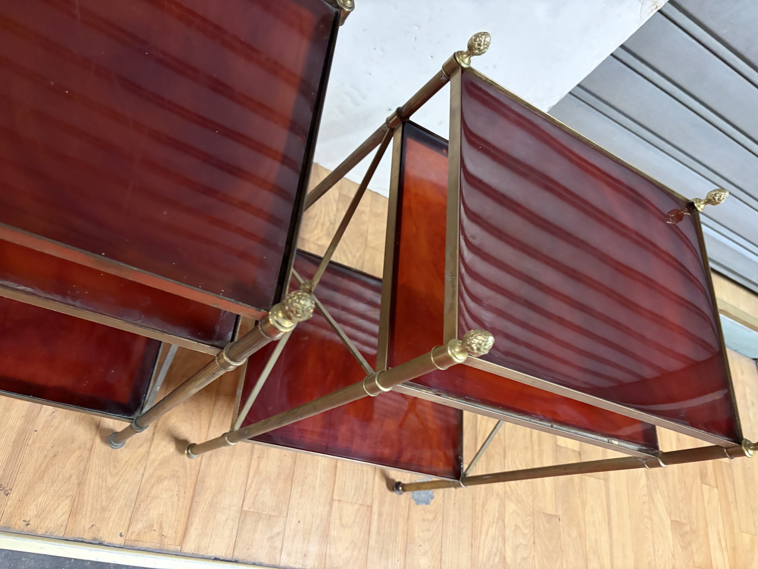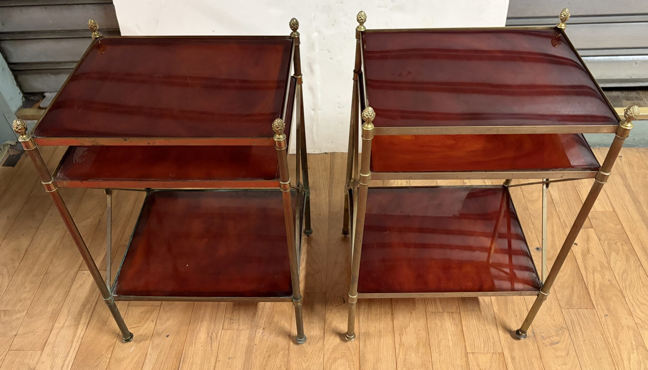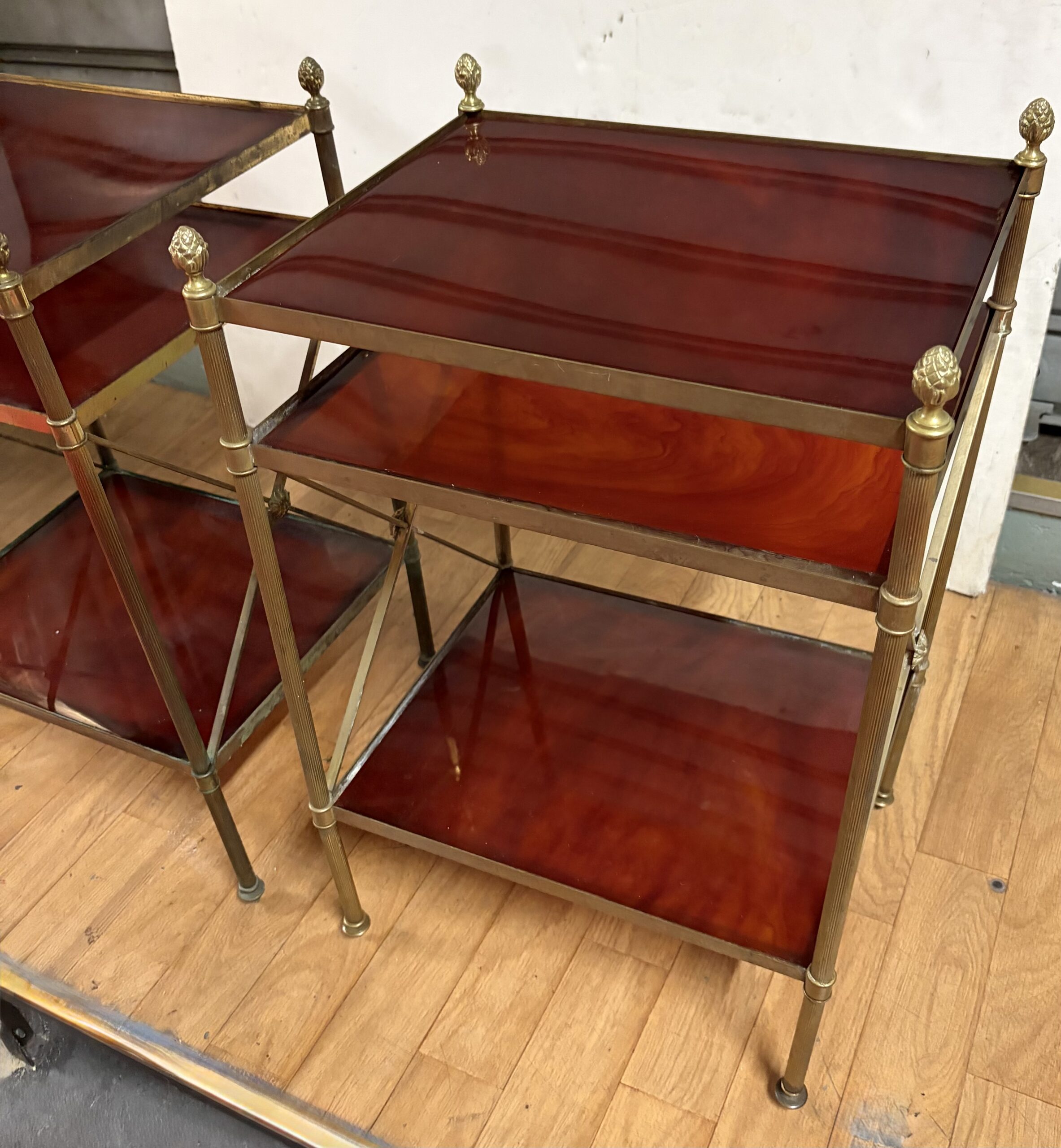 Paire de Bouts de canapé en laiton et bronze à 3 niveaux en bakélite avec pâquerettes au milieu des croisillons, pommes de pin en haut des montants.