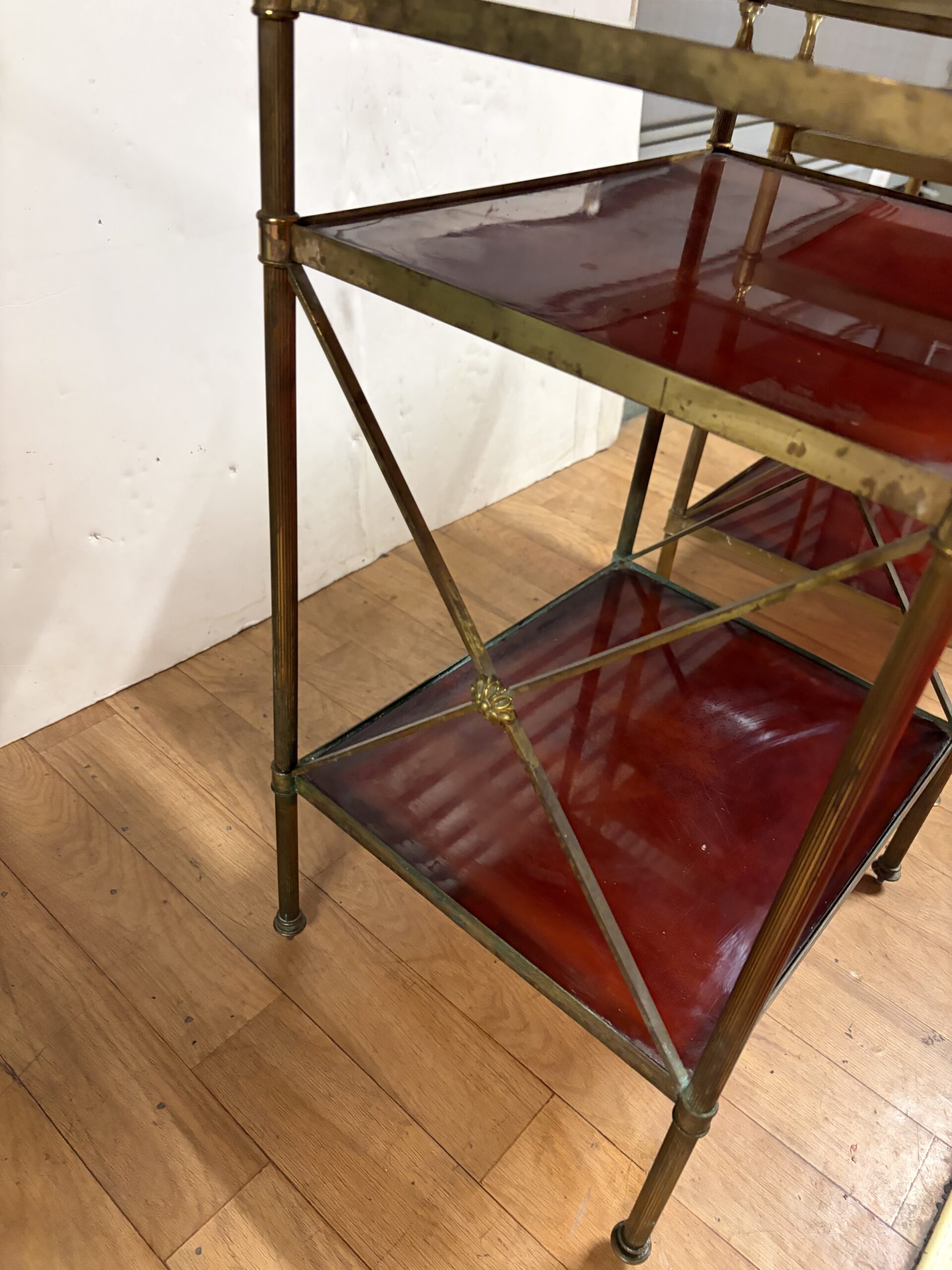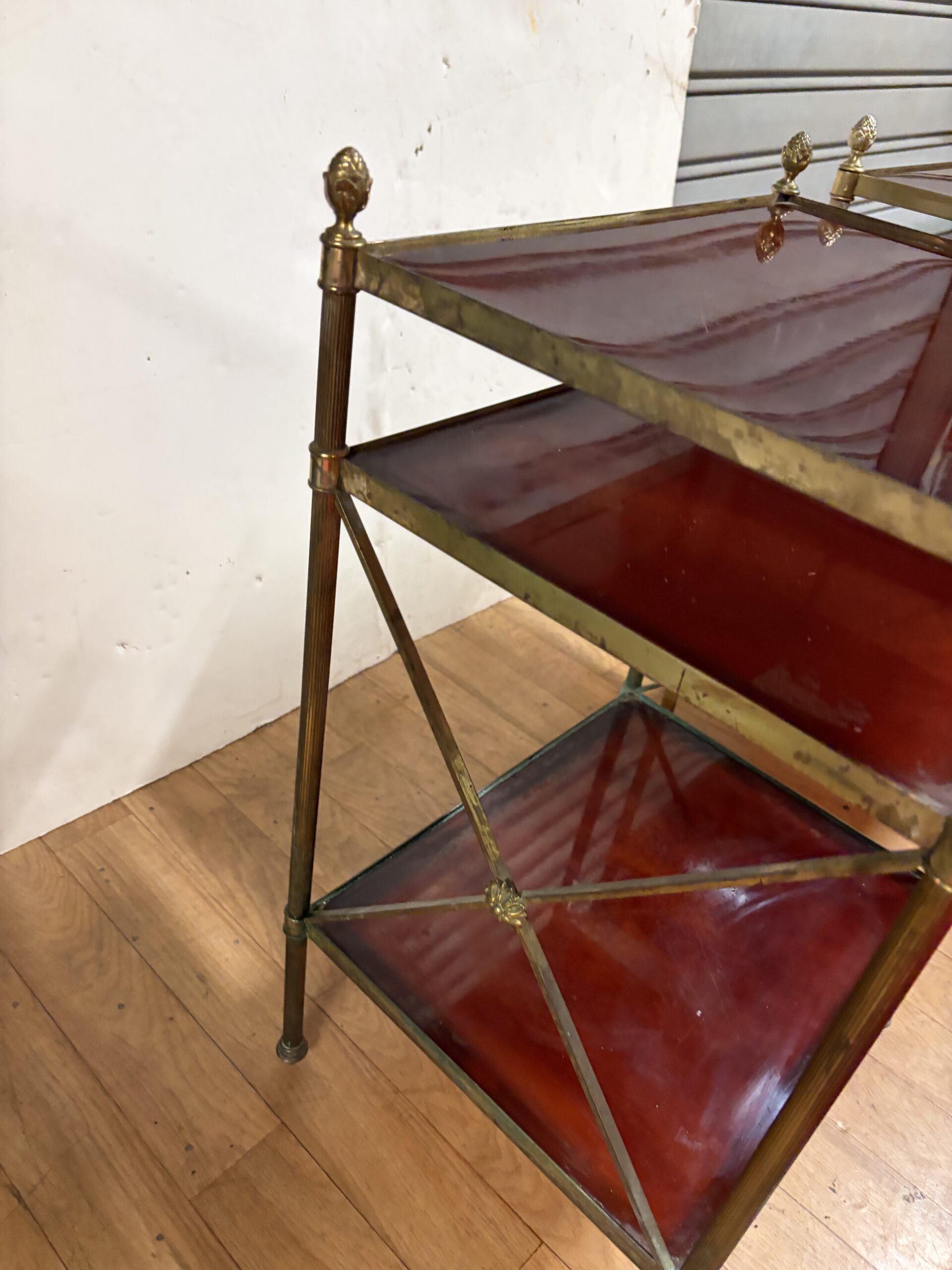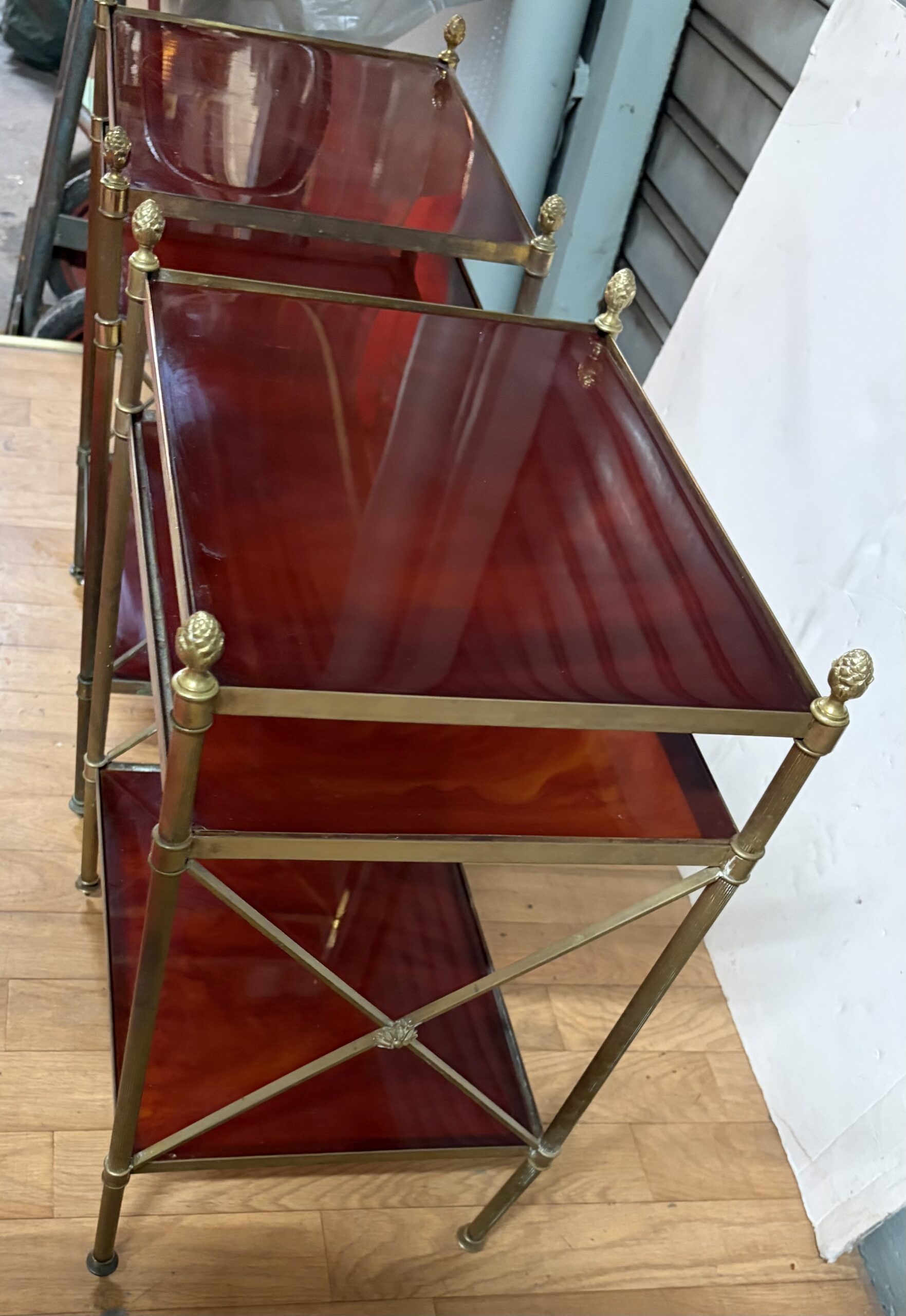 Paire de Bouts de canapé en laiton et bronze à 3 niveaux en bakélite avec pâquerettes au milieu des croisillons, pommes de pin en haut des montants.