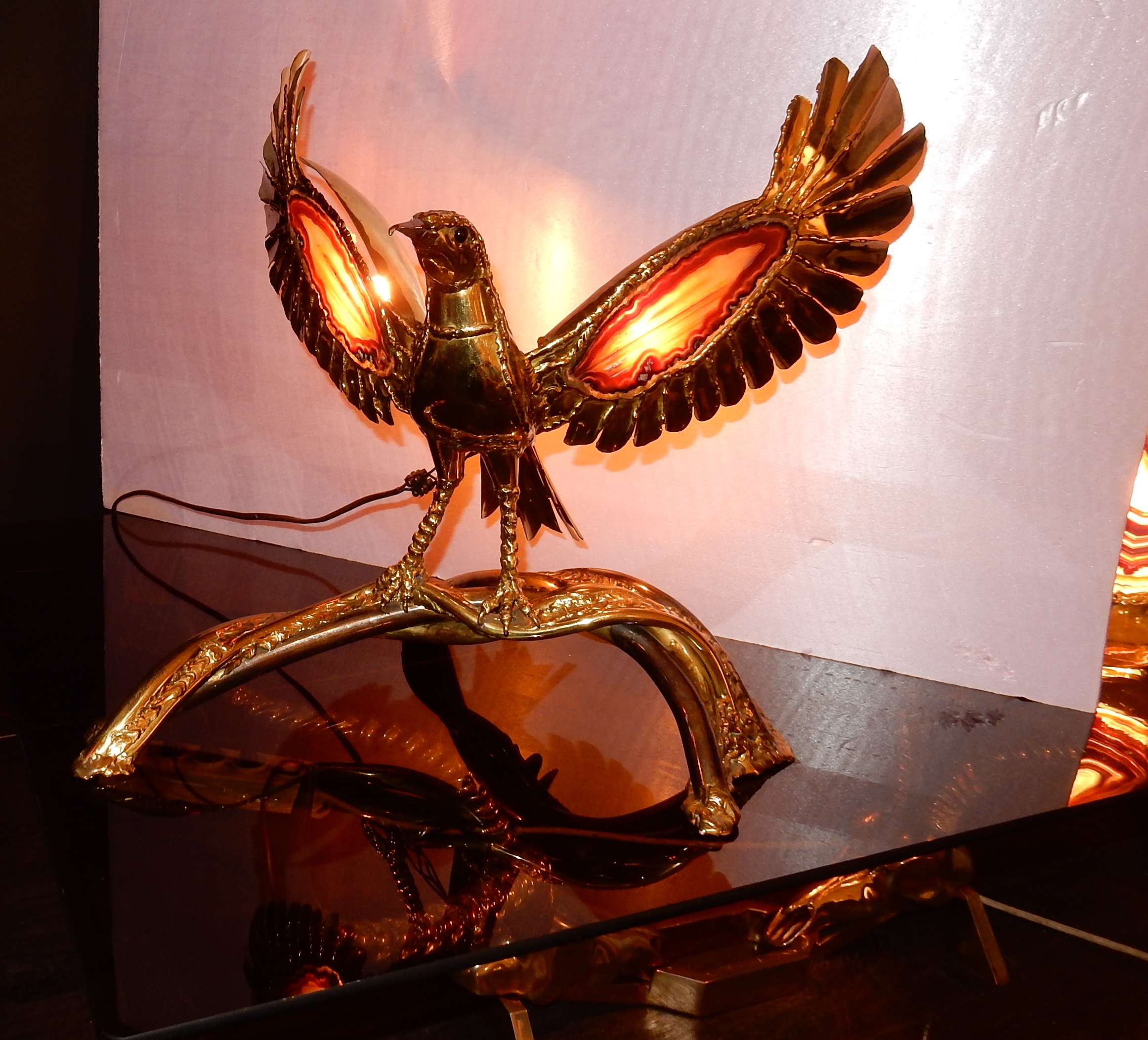 1970' Lampe a L Oiseau en Laiton Avec Agates Par Isabelle Faure